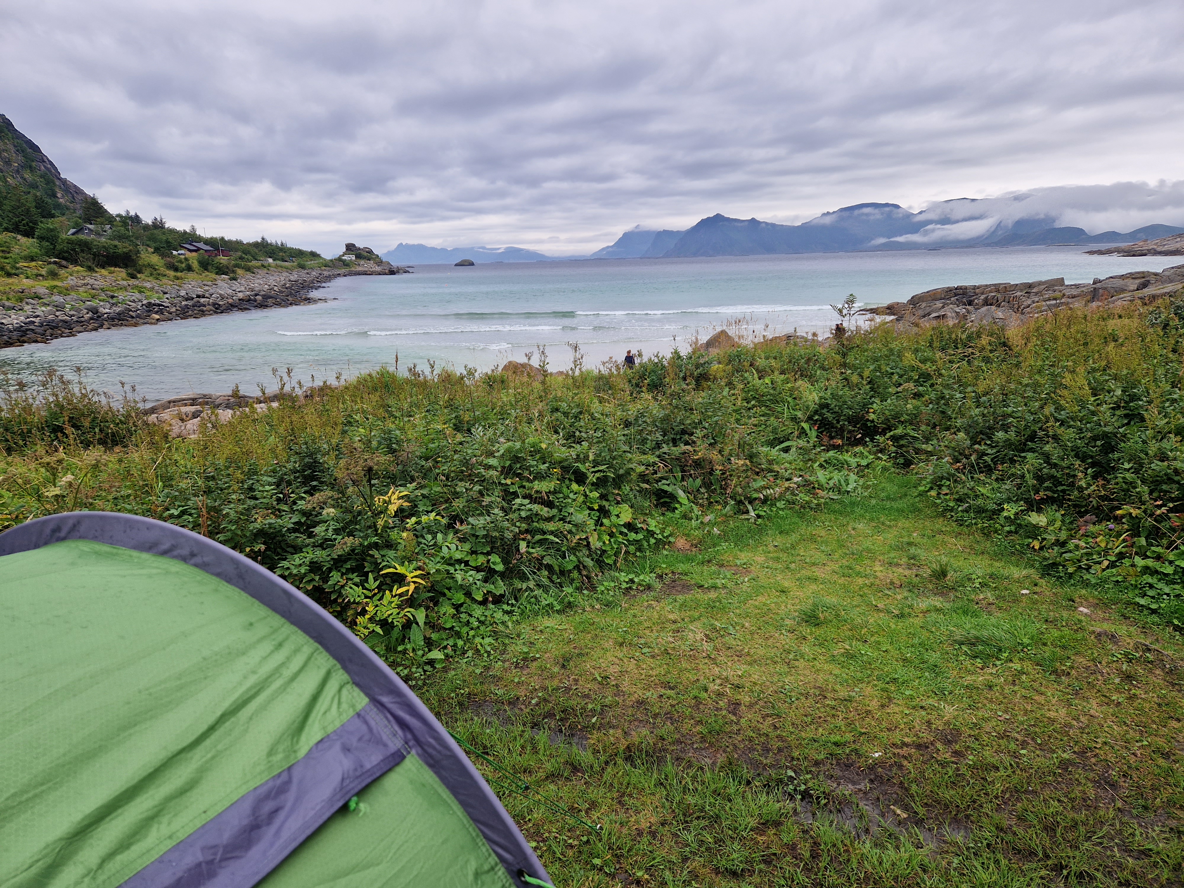 I found the turning and within 100m there was a beach with free camping. That would do. I rode to Henningsvaer a great little fishing village but really I was soaked and just wanted to get some food to see me through.