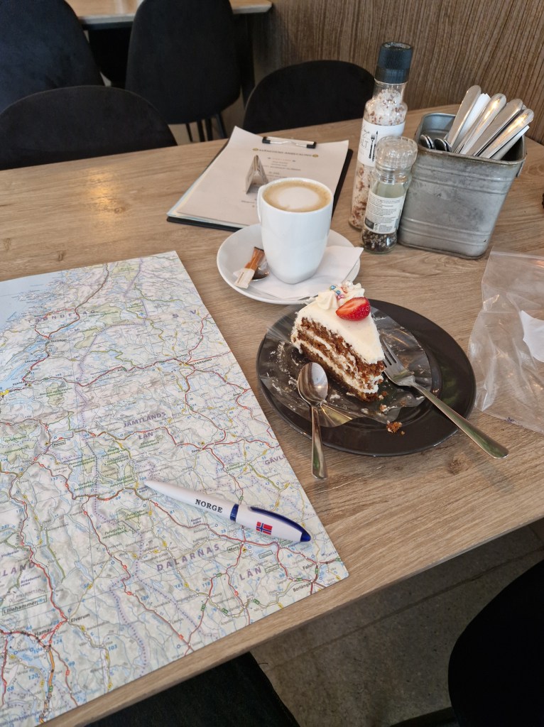 It was 10.30 when I parked the bike in the centre of town. I found the Cake n Coffee Kafé, being a big fan of all those elements I sat down, got the map out and planned my next moves.