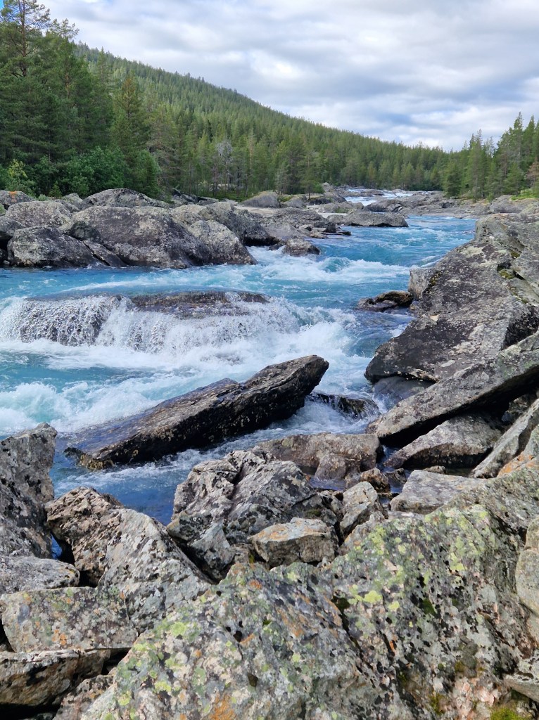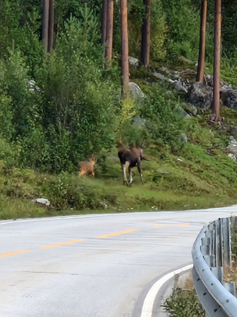 Happy in the heat of the sun I was bumbling along thinking I should stop with the waterfall pics. In my head I said ‘Give me a moose sighting and I’ll stop’. As I rounded the next left hander stood just over the crash barrier was a huge moose with her baby. I tried so hard to stop without scaring them but to no avail. I was within 10 metres of them, a truly beautiful sight. I hit the button on the gopro ‘bleep sd card full’. Obviously they both ran back into the woods. I waited and waited but nothing so I carried on really slowly and then the appeared. I just got the camera out in time to get this….