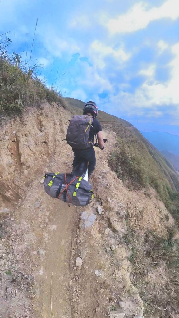 The thought of turning round was not good I had committed to several drops that would be beyond the bikes ability, but now I was on a path just wider than the bike. Either side was a sharp drop or incline and that was no longer rock but dusty earth offering no grip.