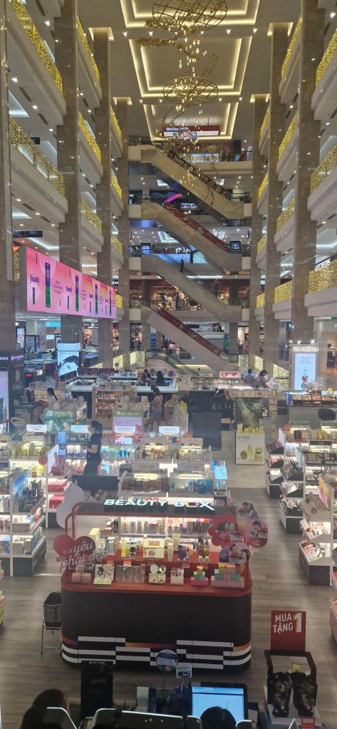 The next thing to know is that my Sketchers have worn out, in fairness weeks ago. Several times, in Vietnam, I lost footing because the sole is so worn flat it aquaplanes on water. I was getting more and more concerned that my footwear was the most likely thing to cause me serious injury. The hunt was on. Saigon Centre is a big shopping centre just opposite the market, both were searched but nothing fitted the textile walking boot I was after. Next an outdoor adventure shop. They had one pair of military boots in my size. I then checked on the location of any Decathlon stores, well, what do you know, there’s one just the other side of the river. TAXI!